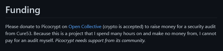 Ideally, the tool/service received an independent security audit from a reputable cybersecurity firm. This is optional, since open-source developers often can't afford the high costs that are involved to hire a security auditor. Picocrypt (Screenshot) is a perfect example of a great privacy tool that struggles to receive funding for an audit.